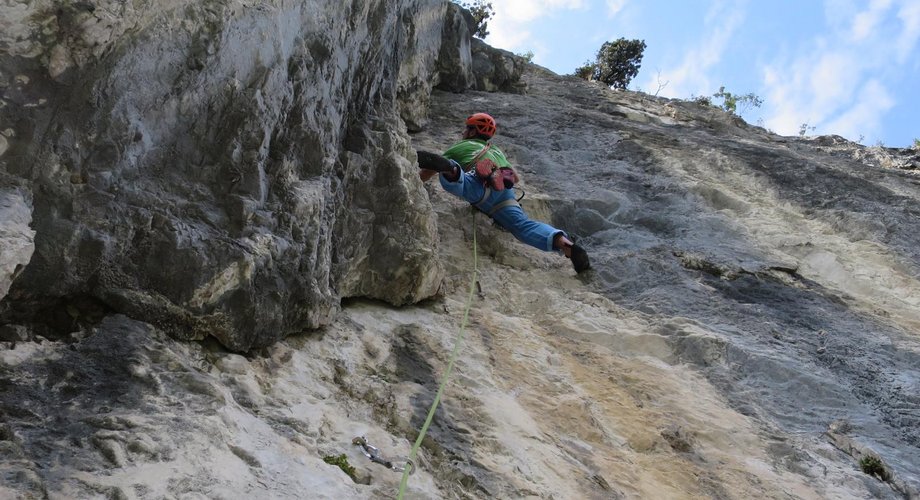 Идеально оборудованный шлямбурами маршрут с техничными ключами. Особенно интересна нависающая стеночка на пятой веревке.